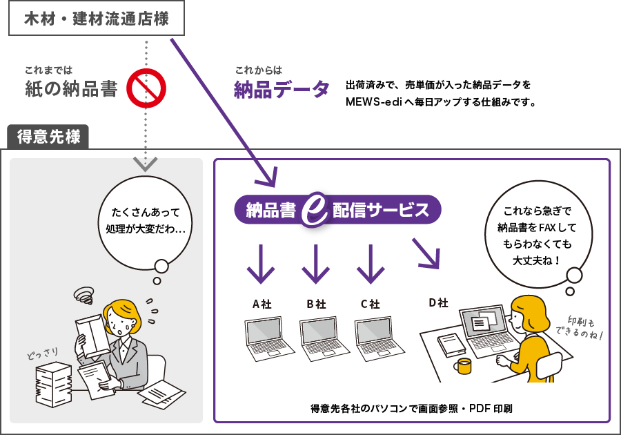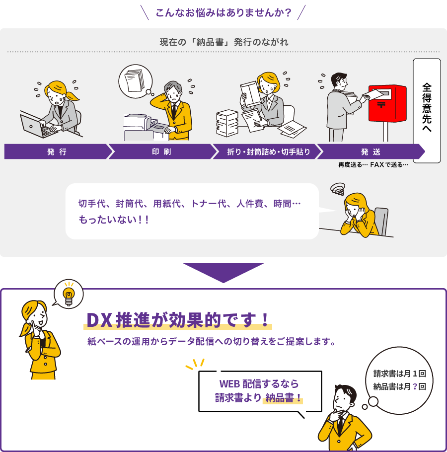 納品書を、従来の”紙”に替わってWeb配信とすることで、印刷、封筒、切手などの経費のみならず、省力化によって新たな余力を産み出します。