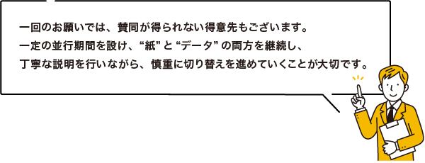 「納品書のWeb 配信をスタートし、ゆくゆく紙の納品の発行・発送を停止します」という方針に賛同が得られた得意先から、Web 配信をスタートし、順次、紙の納品書の発行・発送は停止します。